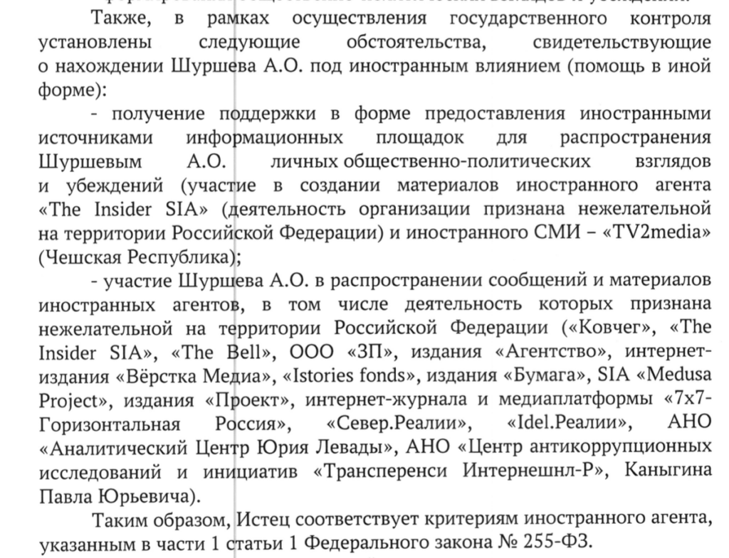 • Шуршев находится «под иностранным влиянием», так как «Хроники медиа» 28 раз упоминали в своих постах других «иноагентов», а TV2media и The insider приглашали его на интервью (то есть «предоставляли площадку для распространения личных взглядов и убеждений»).