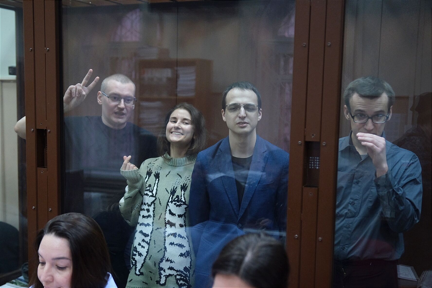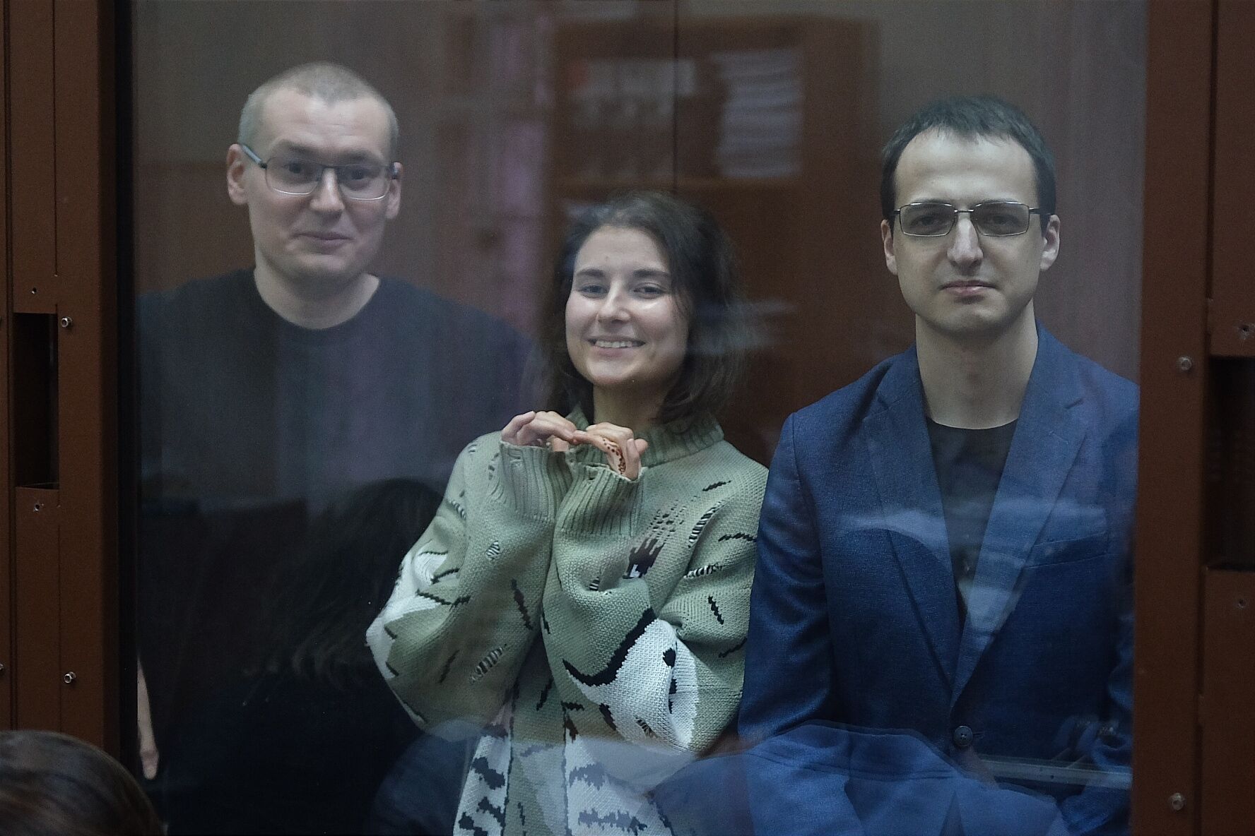 Фото: Василий Неустроев (слева), Анна Архипова, Ян Ксенжепольский (справа) в суде / SOTAvision