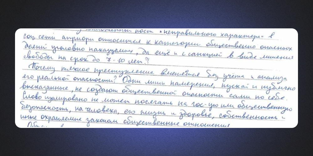 Вместе с тем, одно лишь высказывание намерения совершить убийство не создает состояния опасности и поэтому преступлением не является. Тогда почему выложенный пост «неправильного характера» в соцсети априори относится к категории общественно опасных и уголовно наказуемых деяний, да еще и с санкцией в виде лишения свободы на срок до 10 лет? Почему тяжкое преступление вменяется без учета и анализа реальной опасности? Одни лишь намерения, пускай и публично высказанные, не создают общественной опасности сами по себе.